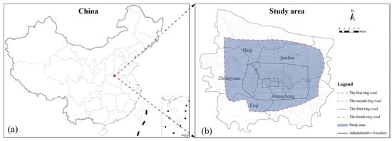 Study area: (a) location of Zhengzhou in China, (b) locations of the four ring roads in Zhengzhou.