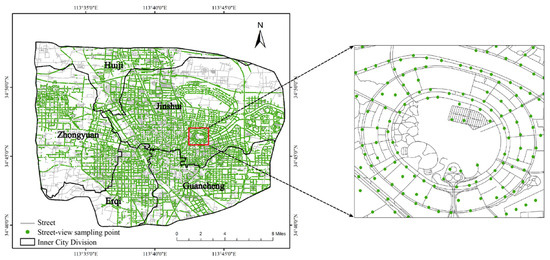 This study utilizes street-view imagery to construct indicators of the street environment and analyzes the impact of these indicators on land surface temperature in areas with different population densities. Roads within the fourth ring road of Zhengzhou City are selected as samples, and surface temperature datasets from 2019 and 2020 are collected. Through comparisons and statistical analyses, this study reaches the following conclusions: