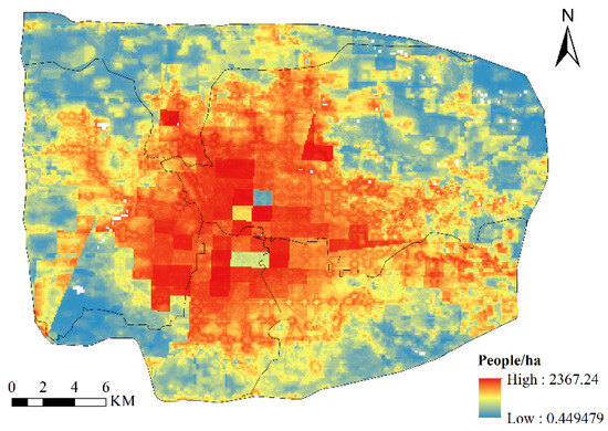 The population density data, which serve as an indicator of human activity, were sourced from WorldPop (https://www.worldpop.org/, accessed on 9 June 2023), with a resolution of 100 m (refer to Figure 3). The sources and descriptions of the data utilized in this study are presented in Table 1.
