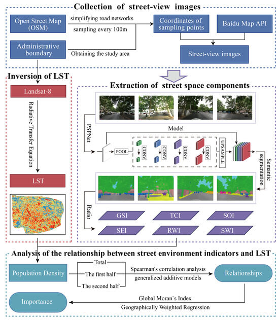 First, this study employs ENVI 5.3 to invert remote sensing imagery, calculating the two-year average land surface temperature (LST) for the research area. Second, using ArcGIS 10.6, streets within the fourth ring road of Zhengzhou City are sampled every 100 m, yielding a total of 7030 sampling points after excluding locations such as tunnels and underpasses. Concurrently, street-view image data at the sampling points are obtained from the Baidu Map API using Python. Subsequently, semantic segmentation techniques are applied to compute the street morphological parameter values at the sampling points. Additionally, population density is utilized as a control variable, examining the nonlinear relationship between street spatial indicators and LST in a grouped study. Finally, geographically weighted regression (GWR) is employed to explore the local relationships and spatial heterogeneity between street spatial indicators and LST. The overall process is depicted in Figure 4.