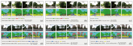 Indicators of the street environment. (a) The green space index refers to the proportion of plant pixels (trees, flowers, grass, etc.) in the image. (b) The tree canopy index refers to the proportion of tree canopy pixels among the plant pixels, representing the vertical structure of greenery along the streets. (c) The sky open index indicates the proportion of sky pixels in the image. (d) The spatial enclosure index is the sum of the proportions of pixels representing buildings, walls, fences, pillars, and other similar elements in the image; appropriate enclosure contributes to ventilation and provides a comfortable feeling. (e) The road width index represents the proportion of pixels for road surfaces, including vehicle lanes and sidewalks, reflecting the relative width of the street. (f) The street walking index refers to the proportion of sidewalk pixels among the road width-related pixels, indicating the relative width of sidewalks in the street.
