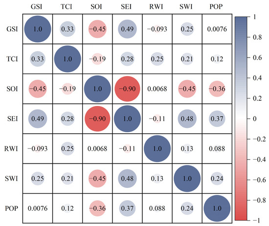 Spearman’s correlation analysis was performed to assess the correlation between all pairs of independent variables. As indicated in Figure 6, there is a significant, strong negative correlation between the SOI and the SEI among the independent variables. The other independent variables do not show multicollinearity, with correlation coefficients below 0.7. Moreover, the correlations between the SOI and the RWI, as well as between the POP and the GSI, are not statistically significant.