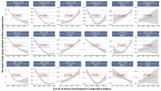 After controlling for the confounding factor of population density, significant nonlinear associations between street composition elements and surface temperature are still observed in both the low-population (LP) and high-population (HP) groups. In the LP group, the GSI, CVI, and SEI all have a nonlinear negative effect on surface temperature, with the SEI’s influence on surface temperature being minimal within the range of 37 °C to 38 °C. In the HP group, the GSI, CVI, and RWI all have a significant nonlinear negative effect on surface temperature. The relationship of the SOI and SWI with surface temperature continues to be primarily positive. The influence trend of the SEI on surface temperature is consistent with the total group, but the surface temperature range that it responds to is reduced to 38 °C to 39 °C.