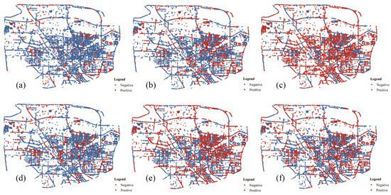 Figure 8 displays the spatial distribution of the regression coefficients for the influencing factors in the GWR model, with positive estimates colored red and negative estimates colored blue (for a detailed distribution of values, refer to Supplementary Materials SB Figure S2). When examining Figure 3, it becomes evident that the regression coefficients for the indicators show a positive effect in the central region, suggesting a spatial correlation with areas of higher population density. More specifically, within the street space indicators, the GSI, TCI, and SEI generally exhibit significant cooling effects, yet they exert a positive effect on regions with dense populations (as shown in Figure 8a,b,d). The SOI consistently demonstrates a positive impact on LST (Figure 8c). Both the RWI and SWI, which generally have a positive influence on LST, are associated with better infrastructure in densely populated central areas, and thus, they also contribute to cooling effects (Figure 8e,f).