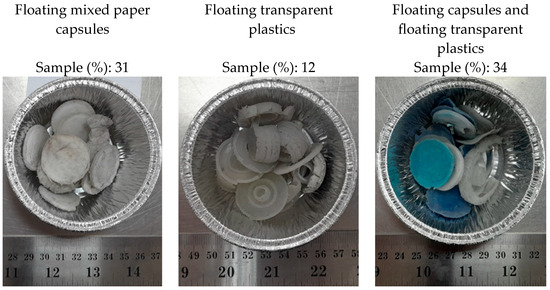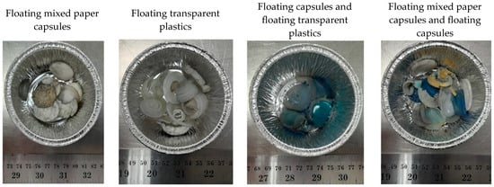 It was observed that the most representative constituents floating mixed paper capsules, floating capsules, and floating transparent plastics melted at a temperature of approximately 120 °C, resulting in approximately 77% of the sample showing promising characteristics for incorporating in bitumen. The aspect of the constituents at the mentioned temperature can be observed in Figure 4. It was also found that the floating constituents (with a lower density than water) were easier to melt at lower temperatures.