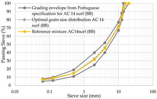 This study involved different fractions of basalt aggregates (0/4 mm, 4/12 mm, 10/16 mm), limestone aggregates (0/4 mm) and a commercial filler, all of which comply with the applicable standards and specifications. Figure 3 shows the aggregates grading curve used to produce both bituminous mixtures and the grading envelop defined in the Portuguese specifications for this type of bituminous mixture [74].