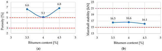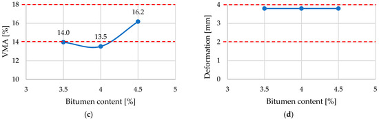 To determine the OBC for the mechanical tests, porosity, Marshall stability, voids in mineral aggregates (VMA), and deformation were evaluated for the three tested bitumen contents (Figure 5).