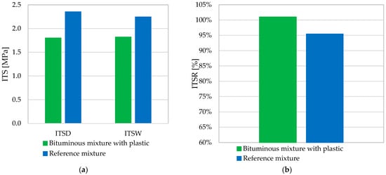 Figure 6a shows the results for indirect tensile strength of dry specimens (ITSD) and wet specimens (ITSW) of the bituminous mixture with plastic and the reference mixture. Under dry conditions, the mixture with plastic exhibited an ITSD of 1.80 MPa, while the reference mixture showed 2.35 MPa. Under wet conditions, the mixture with plastic reached 1.82 MPa and the reference mixture obtained 2.25 MPa for ITSW.