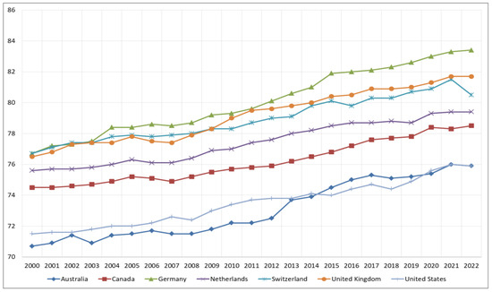 Australia: there is a steady increase from 70.7 in 2000 to 75.9 in 2022, with the indicator reaching its peak in 2021 at 76;