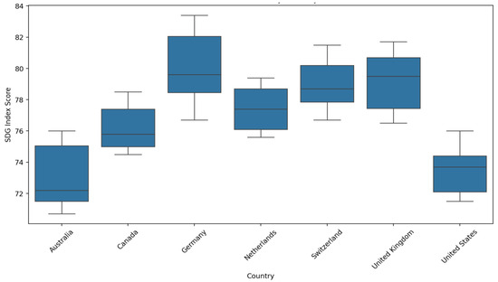 Table 1 provides a clear view of the average SDG Index scores and their variability for each country. By analyzing these metrics, we can identify which countries have consistently higher scores, which exhibit more variability, and how they compare to one another. Let us proceed with a cross-country analysis based on these metrics.