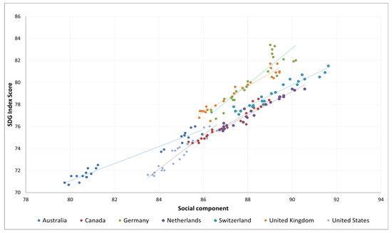 Figure 3 visualizes the relationship between the social component and the SDG Index score for the seven selected countries from 2000 to 2022. A direct positive relationship between these variables is graphically demonstrated. This relationship was quantitatively assessed, and the results are presented in