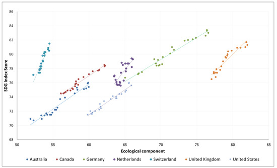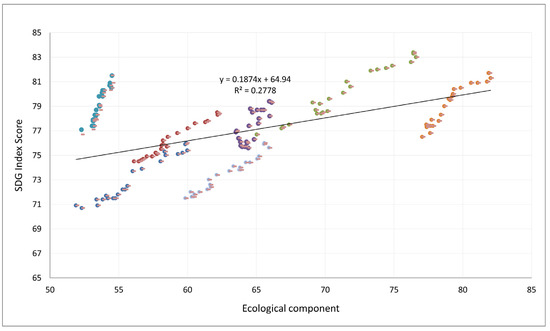 Figure 4 visualizes the relationship between the ecological component and the SDG Index score for the seven selected countries from 2000 to 2022. A direct positive relationship between these two variables is graphically illustrated. Notably, there is greater differentiation among countries compared to the social component. It is important to highlight that the dependency lines for individual countries do not intersect, with each maintaining its own area of dispersion. This unique separation indicates distinct trends in how each country approaches ecological sustainability.