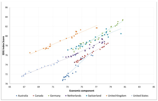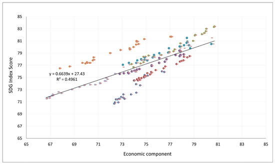 Figure 5 illustrates a direct positive relationship between the economic component and the SDG Index score for the seven selected countries from 2000 to 2022. Additionally, there is observable differentiation in the distribution of the relevant characteristics among these countries. The results of the calculations regarding the correlation between these indicators are presented in