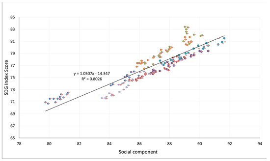 Figure 6, we observe that the aggregated indicators reveal a significantly lower relationship between the social component and the SDG Index score (R