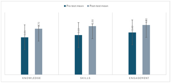 Table 1 presents the mean and standard deviation for the pre- and post-intervention scores in the three measured domains: knowledge, skills, and engagement.