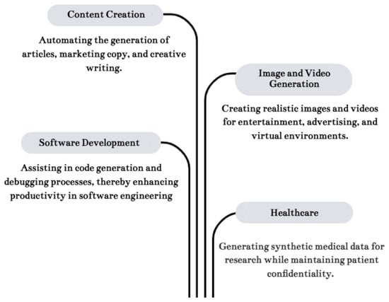 - Madaan, G.; Asthana, S.K.; Kaur, J. Generative AI: Applications, Models, Challenges, Opportunities, and Future Directions. In Generative AI and Implications for Ethics, Security, and Data Management; Gomathi Sankar, J., David, A., Eds.; IGI Global: Hershey, PA, USA, 2024; pp. 88–121. [Google Scholar] [CrossRef]