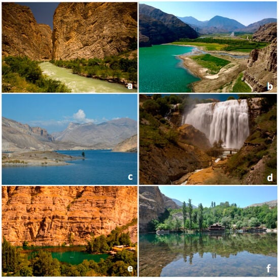 Some important recreational water resources of Uzundere (a) Tortum Stream, (b) Tortum Lake, (c) Uzunburun Peninsula, (d) Tortum Waterfall, (e,f) Yedigöller.