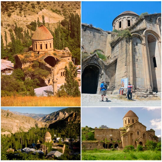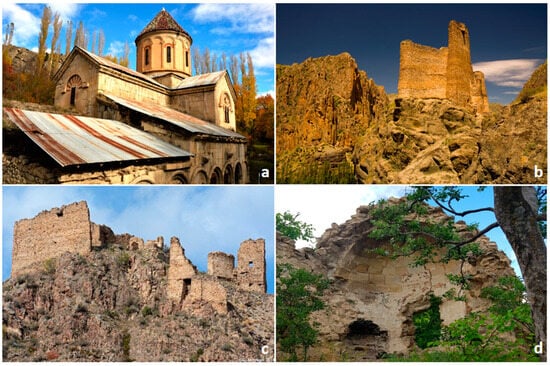 - Özgeriş, M.; Karahan, A.; Akpınar Külekçi, E.; Demircan, N.; Sezen, İ.; Karahan, F. Somut Kültürel Miras Örneklerinin Sürdürülebilir Turizm İlkeleri ile Değerlendirilmesi: Haho Manastırı (Erzurum). Türkiye Peyzaj Araştırmaları Dergisi 2023, 6, 1–14. [Google Scholar] [CrossRef]
