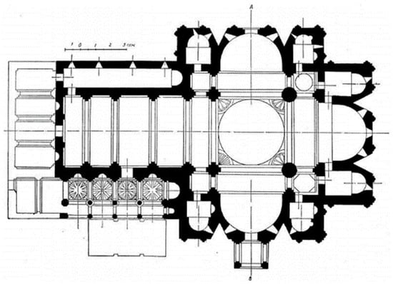Öşkvank Monastery has a mixed plan consisting of a closed Greek cross, triconchos, and basilical plan (Figure 4), and the naos is in the form of a closed Greek cross [68,69]. The Öşkvank Monastery is covered with yellow-colored stone, which is of very high quality and shows fine workmanship in terms of materials. Extremely thick infill walls were built to ensure the durability of the structure.