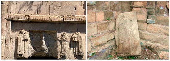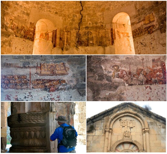 However, some reliefs were destroyed as stones were removed from the church walls [72] (Figure 6). It is stated that one of the oldest images of St. Nino was found here before it was destroyed [62]. Of the frescoes, only three biblical scenes and some figures in the north, south, and east apses have survived to the present day. The roof of the church’s apse section and one of the columns on the front façade were also destroyed and replaced with wooden supports afterwards. The church structure was used as a mosque from the 1800s until 1980. In 1985, the monastery and its surroundings were included among the cultural assets protected by the Turkish Ministry of Culture and Tourism.