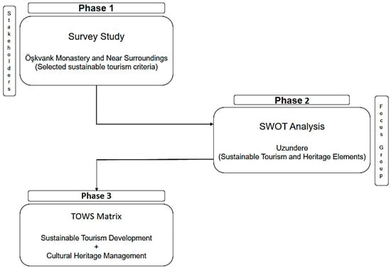This research employed a three-phase mixed methodology combining quantitative (structured questionnaire) and qualitative (focus group interviews and content analysis) studies (Figure 9). In Phase I of the research, Öşkvank Monastery and its immediate surroundings were evaluated in terms of sustainable tourism through a structured questionnaire and survey. In Phase II of the research, a regional sustainable tourism assessment was made by conducting a SWOT analysis with a focus group study. In Phase III of the research, sustainable tourism development and cultural heritage management strategies were developed by creating a TOWS matrix through a focus group study.