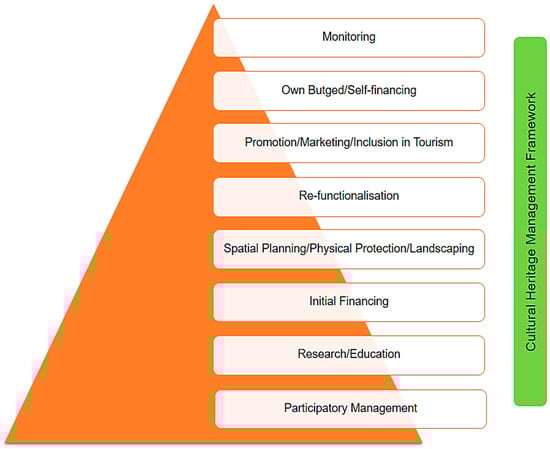 Figure 10 presents a hierarchical model consisting of eight steps for cultural heritage management. CHMF begins heritage management by establishing a participatory management organization, and it aims to train stakeholders, conduct research for heritage documentation, provide initial funding, and prepare spatial planning studies, physical conservation, and landscape projects. The self-financing of heritage elements through their re-functionalization and inclusion in tourism is considered a success of heritage management. CHMF aims to evaluate the whole process with a monitoring system based on a set of indicators.