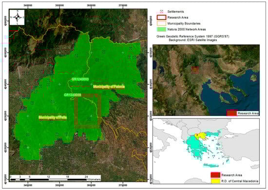 The present research was conducted in the forest complex of Mount Paiko, which is located within the administrative boundaries of the Municipality of Pella, Regional District of Pella and the Municipality of Paionia, Regional District of Kilkis, in the Region of Central Macedonia, Greece. The core area for this study was carefully selected, covering a total surface area of 69.79 km2, as depicted in Figure 1. This entire region is classified as public forest land, and its supervision and management fall under the jurisdiction of the Forest Directorate of Pella, which operates under the Ministry of Environment and Energy of Greece. This designation ensures that the area is subject to government regulations focused on sustainable forest management and conservation.
