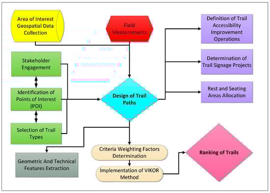 Figure 2 outlines the comprehensive steps undertaken for the implementation of the present research. Initially, geospatial data was collected from the area of interest to ensure accurate mapping and trail design. Simultaneously, stakeholder engagement was conducted to identify key points of interest (POIs) and determine the appropriate types of trails based on the needs of the community and visitors. This was followed by the extraction of geometric and technical features necessary for the development of the trail paths. Field measurements were then integrated to guide the detailed design of the trails, ensuring they met technical specifications. Once the paths were designed, efforts were made to define accessibility improvement operations, plan trail signage projects, and allocate rest and seating areas to enhance user experience. Finally, the VIKOR method was applied to rank the trails by determining weighting factors for various criteria, providing a structured approach to optimizing trail development and ensuring a balanced consideration of all relevant factors.