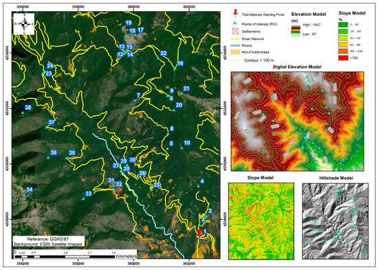 This comprehensive identification of points of interest not only enhances the visitor experience by showcasing both cultural and natural highlights but also helps in the conservation and promotion of these areas. The integration of forest roads and the design of the trail network ensure that visitors can access these points while preserving the ecological and scenic values of the region. The detailed topographic, slope, and elevation models included in Figure 3 further contribute to the understanding of the area’s terrain, aiding in both the planning and implementation of sustainable trail development.