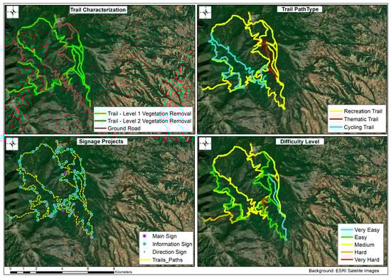 Based on these parameters—length, slope, and type of terrain—the trails were classified according to their level of difficulty. The classification system ranged from “Very Easy” and “Easy” to “Medium”, “Hard”, and “Very Hard”. This categorization ensured that the trail network could accommodate a diverse range of users, from beginners seeking leisurely walks to advanced hikers looking for more challenging terrain. By providing this range of options, the trail system enhances accessibility while promoting broader engagement with the natural environment.
