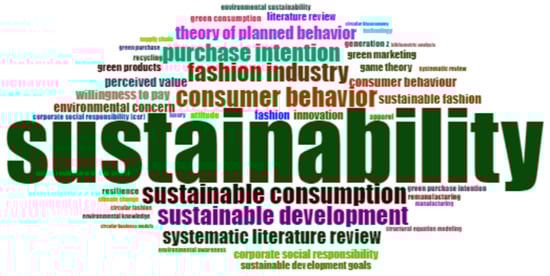 The word cloud visualizes the keywords selected by authors, underscoring the specific focus of their research and its alignment with environmental and sustainability issues (Figure 2). Terms presented in larger sizes exhibited greater frequency, with prominent examples including “sustainability”, “sustainable consumption”, “fashion industry”, and “consumer behavior”. These terms reflect an evolving mindset within both consumer groups and manufacturing sectors in the fashion industry. On the consumer side, keywords such as “purchase intention”, “willingness to pay”, and “perceived value” are evident, highlighting the need for buyers to adapt their purchasing habits and willingness to pay for circular, environmentally conscious products. For manufacturers, terms such as “corporate social responsibility”, “green marketing”, and “green products” illustrate the growing importance of integrating sustainability into business practices. This shift requires companies to adopt a sustainability-centered approach, fostering a new cultural and operational paradigm that not only prioritizes environmental responsibility but also enables clear and genuine communication with consumers through eco-friendly marketing strategies.
