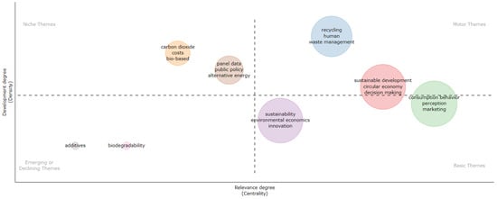 The basic themes quadrant includes the foundational elements of the field, including “consumption behavior”, “perception”, and “marketing”. These terms reflect the importance of understanding market dynamics and consumer attitudes, which are crucial for promoting circular fashion. Finally, the niche themes quadrant includes specialized topics blending economic and environmental dimensions, such as “carbon dioxide”, “costs”, and “bio-based”. These keywords highlight the potential benefits of a bio-based economy.