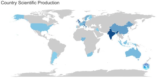 Geographically, the majority of the scientific contributions originated in India (142), followed closely by China (141) and Italy (98). England (68) and the United States (65) also made significant contributions. Figure 1 and Figure A2 provide a visual representation of these data, with darker colors indicating regions with higher levels of scientific output.