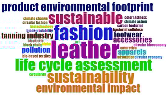 Figure 6 displays the word cloud, in which “leather” and “fashion” appear prominent, directly referencing the material under study and its context within the fashion industry. Other terms of similar prominence include “sustainability”, “environmental impact”, and “life cycle assessment” (LCA).