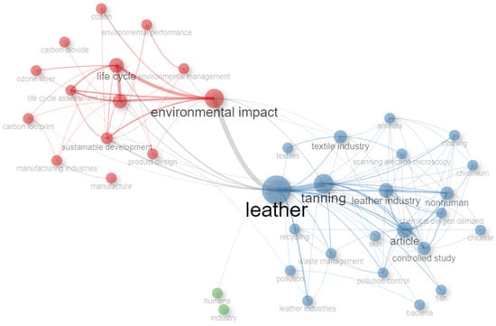In the co-occurrence network (Figure 7), the term “leather” stands out as the central node, underscoring its primary focus in the research. From this central node, two distinct clusters are evident: one addressing environmental impacts and sustainable practices, and another centered on industrial processes and specific issues related to tanning.