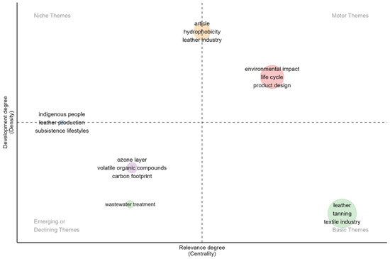 The thematic map (Figure 8) identifies key themes within leather research, categorized according to relevance and level of development. Themes such as “environmental impact” and “life cycle” are central, as they enable a comprehensive understanding of the environmental effects of leather production, from raw material sourcing to product disposal. Within this context, “product design” plays a crucial role.