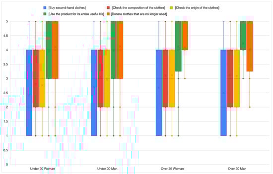 - What sustainable actions characterize your clothing buying habits? Options: buying second-hand garments, checking garment composition, checking garment origin, using products throughout their useful life, and donating unused garments. (1 = never, 5 = very often)