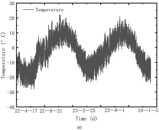 As shown in Figure 2, the monitoring results showed that the beam-joint space had a decreasing trend, and the beam joint on both sides decreased by about 1 cm between January 2019 and November 2020. With the continuous decrease of temperature, the relative deformation of the joint between the grid beam end and the abutment beam first increased and remained stable for a period of time, and the maximum relative deformation was 4.2 mm on the upper part of the right beam seam. With the increase of temperature, the relative deformation of the beam connection gradually decreases, and the minimum relative deformation is located at the lower part of the right beam joint, which is 7.9 mm. After two winter and summer cycles, the reduced relative deformation in summer is greater than the increased relative deformation in winter, and the joint spacing in 2023 is further reduced compared to that in 2022. The reason for the above phenomenon is that the cooling rate of the concrete beam body is obviously faster than that of the subgrade behind the platform, and the concrete beam body shrinks in advance, resulting in the relative deformation of the beam end-abutment connection. As the temperature continues to remain below zero and the ground temperature of the subgrade behind the platform gradually drops to below zero, there is a certain possibility of frost heave deformation, which may have a horizontal extrusion effect on the abutment. In the relative deformation of the beam joint of this abutment, it can be seen that the abutment has a certain horizontal displacement. After the temperature rise in late May 2022, the deformation of the beam itself gradually begins to recover. The relative deformation becomes smaller gradually, which is because the horizontal displacement caused by frost heave extrusion behind the abutment cannot be recompensated at low temperatures. According to the temperature−time history curve of the K1013 + 358 bridge, the temperature in November 2021 has entered temperatures below zero. From March 2022, the daytime temperature gradually rises above zero, and by the beginning of June, the temperature will be virtually above zero. The overall minimum temperature is below −27 °C, and the maximum temperature is above 20 °C.
