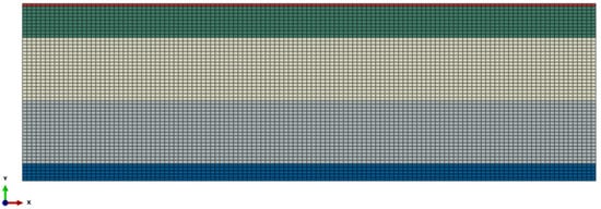 Assuming that the filler layer and the foundation soil layer are evenly distributed in the subgrade model, a two-dimensional numerical model of the subgrade temperature field is constructed based on reference as shown in Figure 7. It is established with reference [34], which lays the foundation for the numerical simulation of the temperature field of the road-bridge transition model. The roadbed is 100 m long along the longitudinal length, the depth of the roadbed is 30.93 m, the surface layer of the foundation bed is 0.5 m thick graded gravel, the bottom layer of the foundation bed is the roadbed filler, and the types of soil below the original soil, from top to bottom, are fine sand, subsoil, bottom-bearing ice, and mudstone. The thermodynamic and physico-mechanical parameters are listed in Table 1. There are many grid elements, with a total of about 14, 803 elements and 15, 337 nodes, and a long data extraction interval is set to store the calculation results in the calculation process of the exploration of the initial temperature field of the transition section to shorten the calculation time.