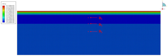 Due to the large difference between the initial temperature field and the actual temperature distribution of the subgrade, it takes a long equilibrium iteration to obtain a more balanced subgrade temperature field calculation result. In order to obtain a stable solution of the subgrade temperature field, the temperature field of the soil below the subgrade surface in 30 years was calculated without considering the temperature rise, and the three typical monitoring points D1, D2, and D3 in the middle and upper part of the subgrade model (located about 4.5 m, 9 m, and 14.5 m below the subgrade surface from the center line of the model, respectively) were taken as shown in Figure 4.