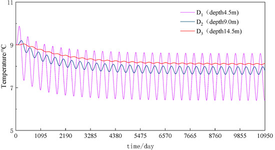 Figure 5 shows the temperature−time history curves of typical subgrade monitoring points D1, D2, and D3, and it can be seen that the annual variation of temperature at different buried depths below the surface of the subgrade gradually decreases after 15 years (day 5475), and the subgrade temperature field is basically stable. Therefore, the results of the temperature field calculation after 20 years and the corresponding time point when it reaches stability can be used as the initial temperature field in subsequent calculations. Comparing the monitoring data of D1, D2, and D3, it can be found that the time taken for shallow soil to reach relative equilibrium is shorter than that of deep soil, which is due to the fact that shallow soil is closer to the upper boundary of temperature, so the heat exchange is faster and it is relatively easier to reach the equilibrium state.