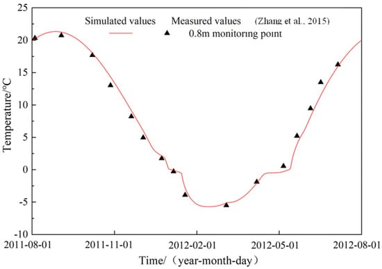In order to reduce the workload, only the more representative simulation data are extracted for comparative analysis, and the numerical simulation results from 1 August 2011 to August 1 of the following year are taken to compare the calculated results with the measured data in Ref [33]. As shown in Figure 6, it can be seen that the temperature simulation results of the subgrade temperature field are not only basically consistent with the monitored temperature in numerical terms, but are also quite consistent with the monitored temperature in phase, indicating that the temperature field model established in this section is reliable and can simulate and reproduce the actual distribution of the subgrade temperature field.