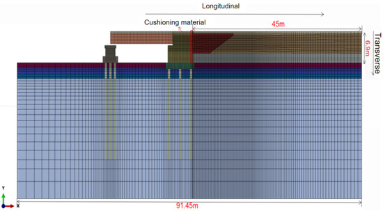 The environmental influence of seasonal freezing and thawing forces the longitudinal shear effect of the bridge abutment, and the differential settlement between the subgrade and the bridge abutment will significantly affect traffic safety. In this work, based on the finite element simulation analysis method, the longitudinal push-out effect and differential settlement of the transition section caused by cycles are systematically investigated, and the treatment results under different control measures (buffer layer thickness) are compared and analyzed. The results show that changing the thickness of the buffer material in the transition section has no significant influence on the overall temperature field of the subsurface. The longitudinal displacement of the transition region will be obvious under the condition of seasonal cycle, and its longitudinal thrust effect on the abutment shows a typical periodic law with the seasonal change. As the depth of the lower soil layer from the surface increases, the pushing effect becomes weaker and weaker. The development of the different subsoil settlements in the transition section also showed periodic changes with the passage of seasons. The differential settlement of the transition section after the buffer layer treatment can be effectively controlled, and the maximum value of the surface settlement of the roadbed after the 5 cm thick buffer material is reduced by 35%, compared with the two deformations of frostshocked bridges, where differential settlement after the buffer material treatment creates only tip deformation. After using a 15 cm thick buffer layer material treatment, the maximum settlement value of the surface settlement of the road base is reduced from 0.2 m to 0.01 m, which will not affect safety and driving comfort. The research conclusions can provide a reference for the design of road and bridge transition sections in frozen areas.