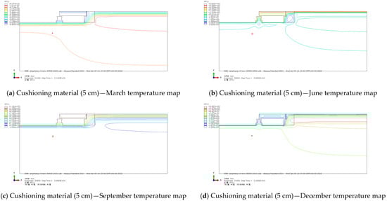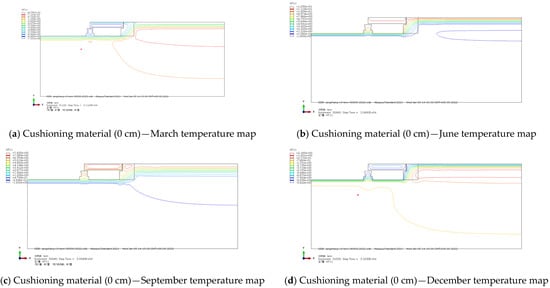 As shown in Figure 9, the simulation results of the temperature field of the transition section of the road and bridge are given in March, June, September, and December each year, with and without buffer material disposal measures (the thickness of the buffer material is 0 cm, 5 cm, 10 cm, and 15 cm).