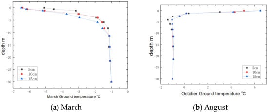 From Figure 6, it can be emphasized that March and August are the beginning stages of the increase and decrease of atmospheric temperature in the frozen area, but for the tundra temperature, March should be the season with the lowest cold temperature transfer from the cold season to the ground temperature below the surface, and August should be the season with the highest heat transfer from the warm season to the ground temperature below the surface. In addition, the simulation results show that the change of the thickness of the buffer material in the transition section has no significant effect on the overall temperature field, because the design and application of the buffer material mainly considers the absorption capacity of the longitudinal frost heave force. That is, the material stiffness is different from that of the ordinary subgrade filler, and there are no special ones with requirements for thermophysical properties.