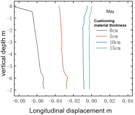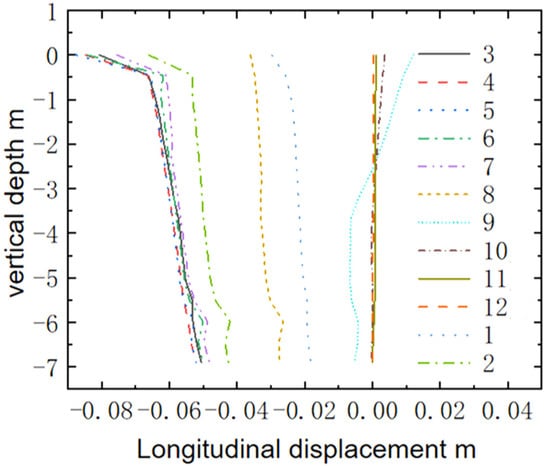 Figure 11 shows the distribution of longitudinal displacement along the depth direction during the freezing–thawing process of the roadbed in the transition area in different seasons. In the figure, the negative longitudinal displacement indicates the effect of longitudinal pressure on the abutment.