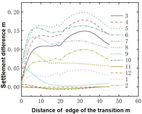 Variation of differential settlement in different seasonal transition sections. (The straight lines of the different numbers represent the change in temperature with depth from January to December).
