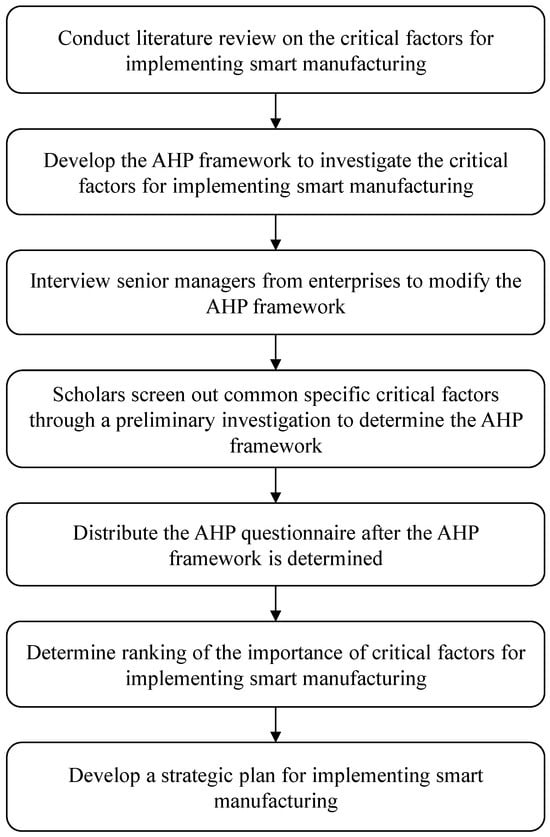 The literature on the implementation of 4IR emphasizes the importance of effective management, processes, technologies, partnerships, and human resources [,]. These critical factors can be categorized into three broad aspects: organization, management, and environment. In this study, we adopted the technology-organization-environment (TOE) viewpoint as the analysis framework to categorize the critical factors for implementing smart manufacturing, identified through literature analysis and interviews of industry experts. AHP was applied to extract experts’ opinions about the importance of the identified critical factors for introducing smart manufacturing. As the critical factors are complex, the experts’ intrinsic knowledge can play important roles in assessing the factors.