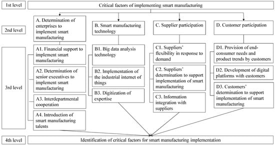 To verify the appropriateness of relevant items for the AHP framework, we conducted the third wave of expert interviews. The interviews were aimed to determine the adequacy of the identified critical factor categories. The industry experts we interviewed suggested better descriptions of two categories, namely that “Internal management of enterprises” be changed to “Determination of enterprises to implement smart manufacturing” and “Manufacturing technology” to “Smart manufacturing technology”. Thus, the key factors for implementing smart manufacturing were divided into four categories: determination of enterprises to implement smart manufacturing (A), smart manufacturing technology (B), supplier participation (C), and customer participation (D). Table 3 shows the definitions of these factors in the AHP framework.