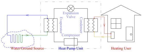 Since the “Winter Clean Heating Plan” [1] was implemented in northern China, the heating energy consumption in most cities has been effectively restrained [2,3]. In the meantime, heating efficiency has been enhanced, leading to a noticeable improvement in the ecological environment [4,5]. In this process, national industrial and energy structures have been continuously optimized, with various types of waste heat and renewable energy gradually replacing coal-fired boilers as the preferred clean heat sources [6,7,8]. Heat pumps directly enhance the quality of heat within these clean heat sources, improving the availability of clean energy [9,10]. Figure 1 shows the schematic diagram of a water/ground-source heat pump heating system.